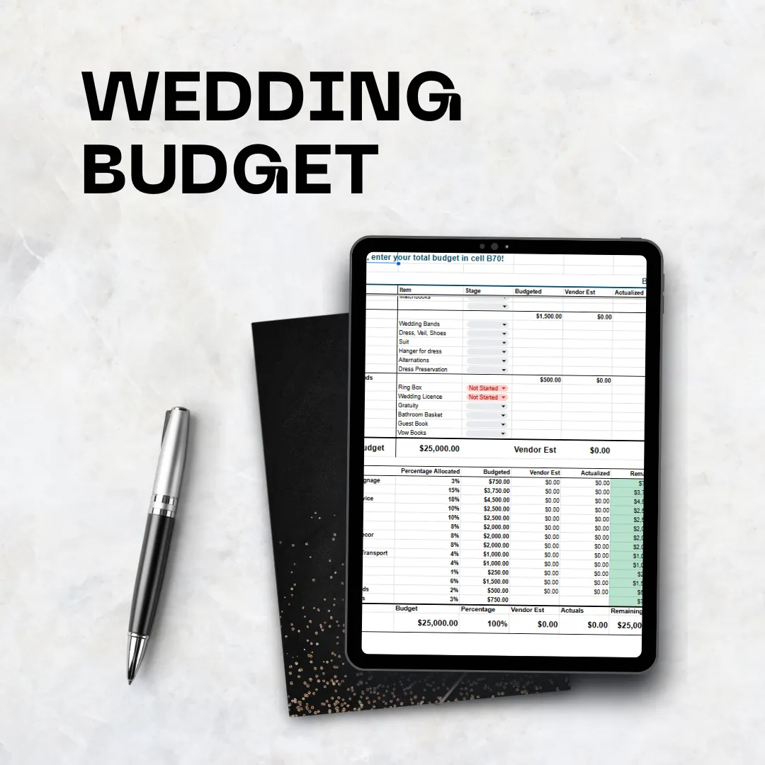 Stay completely organized, on budget and this stress-free with our comprehensive wedding planning & budgetary control spreadsheet. This detailed spreadsheet breaks down every task, deadline, and milestone from engagement to the big day, ensuring nothing falls through the cracks. It helps you to plan every aspect of your wedding and stay within your budget.